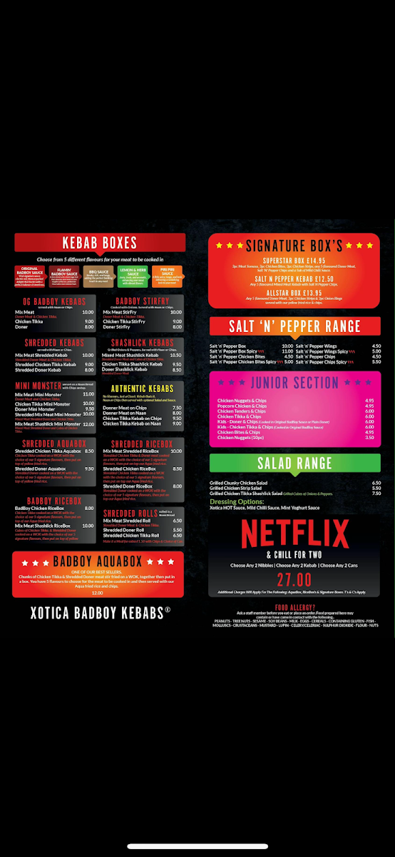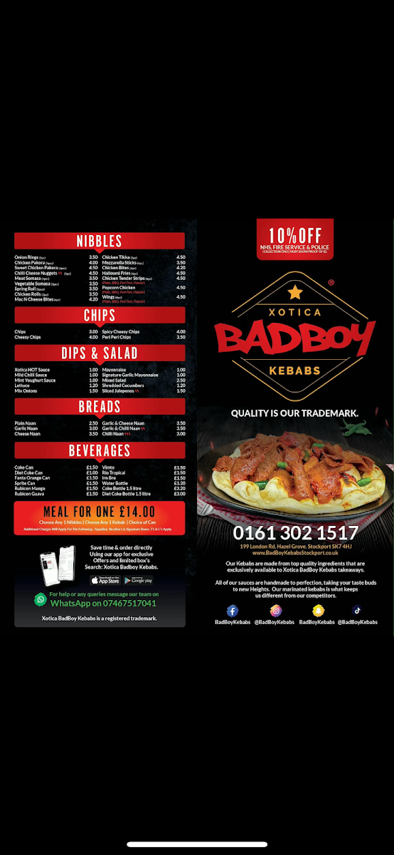 Xotica BadBoy Kebabs Stockport offers a succulent take on classic kebabs and stir-fry dishes that truly satisfy. Nestled in Hazel Grove, this takeout spot shines with its signature boxes and hearty stir-fry options. Highlights include the Superstar Box, a generous combo of somasas, chicken bites, strips, and a variety of flavorful doner meats paired with salt 'n' pepper chips and a mild chili sauce—perfect for sharing. The Allstar Box and Salt N Pepper Box bring variety, combining fried rice, onion rings, and crispy chicken bites to round out the experience. The stir-fry selections, from mixed meat to chicken tikka, boast fresh, high-quality meats drenched in flavorful sauces, served hot and in sizable portions. Customers rave about the addictive salt and pepper chips and soft naan, highlighting the exceptional value and consistency. Paired with a refreshing range of beverages, Xotica BadBoy Kebabs serves up comfort food that’s bold, fresh, and deeply satisfying—ideal for anyone craving authentic, takeaway excellence in Stockport.